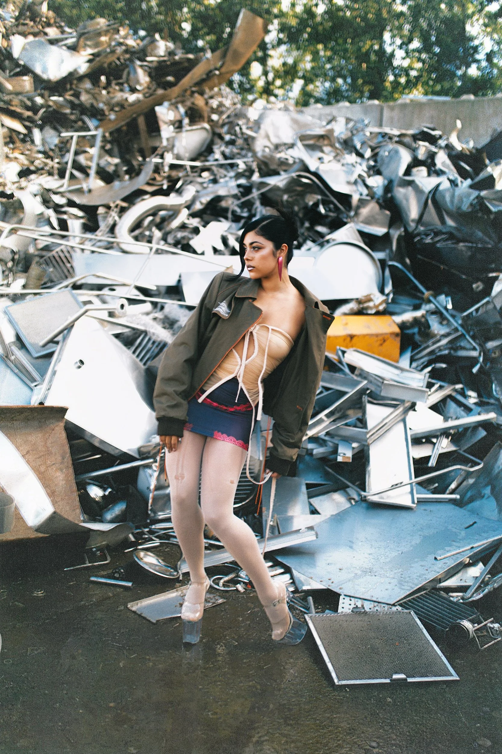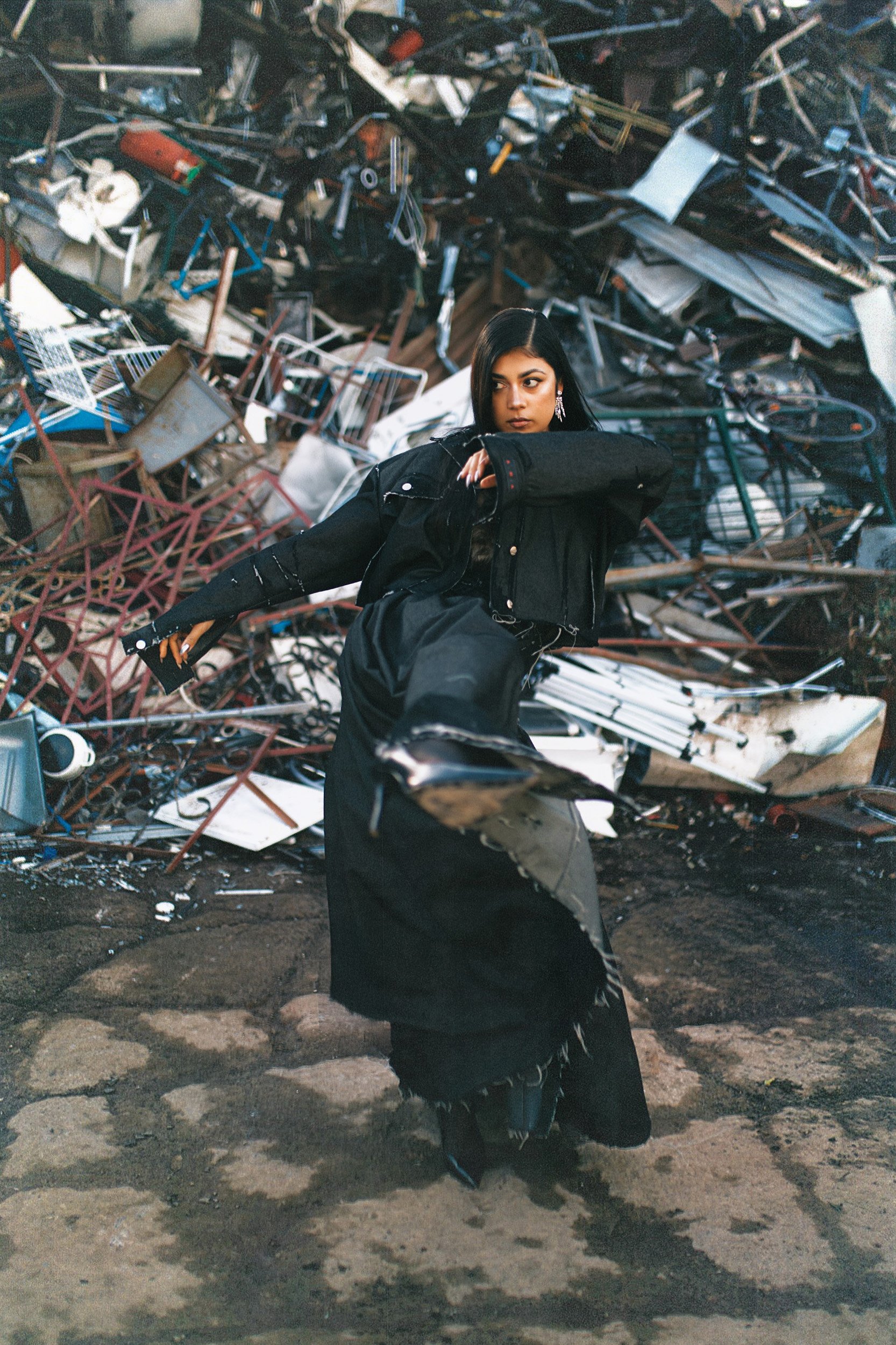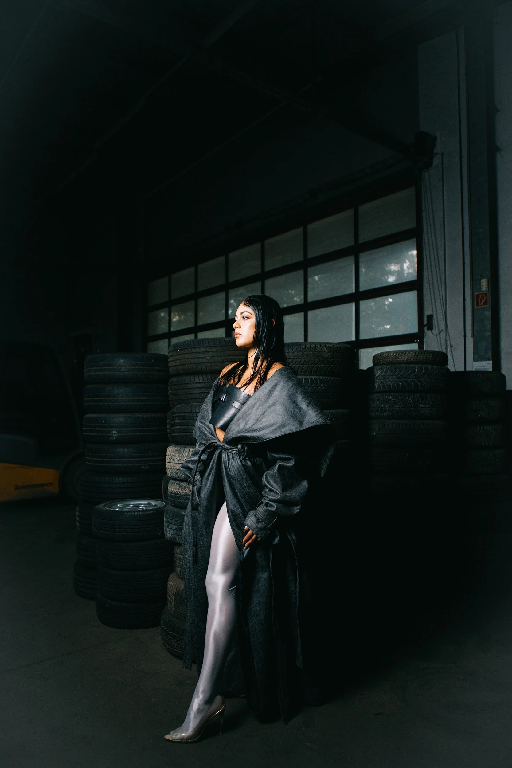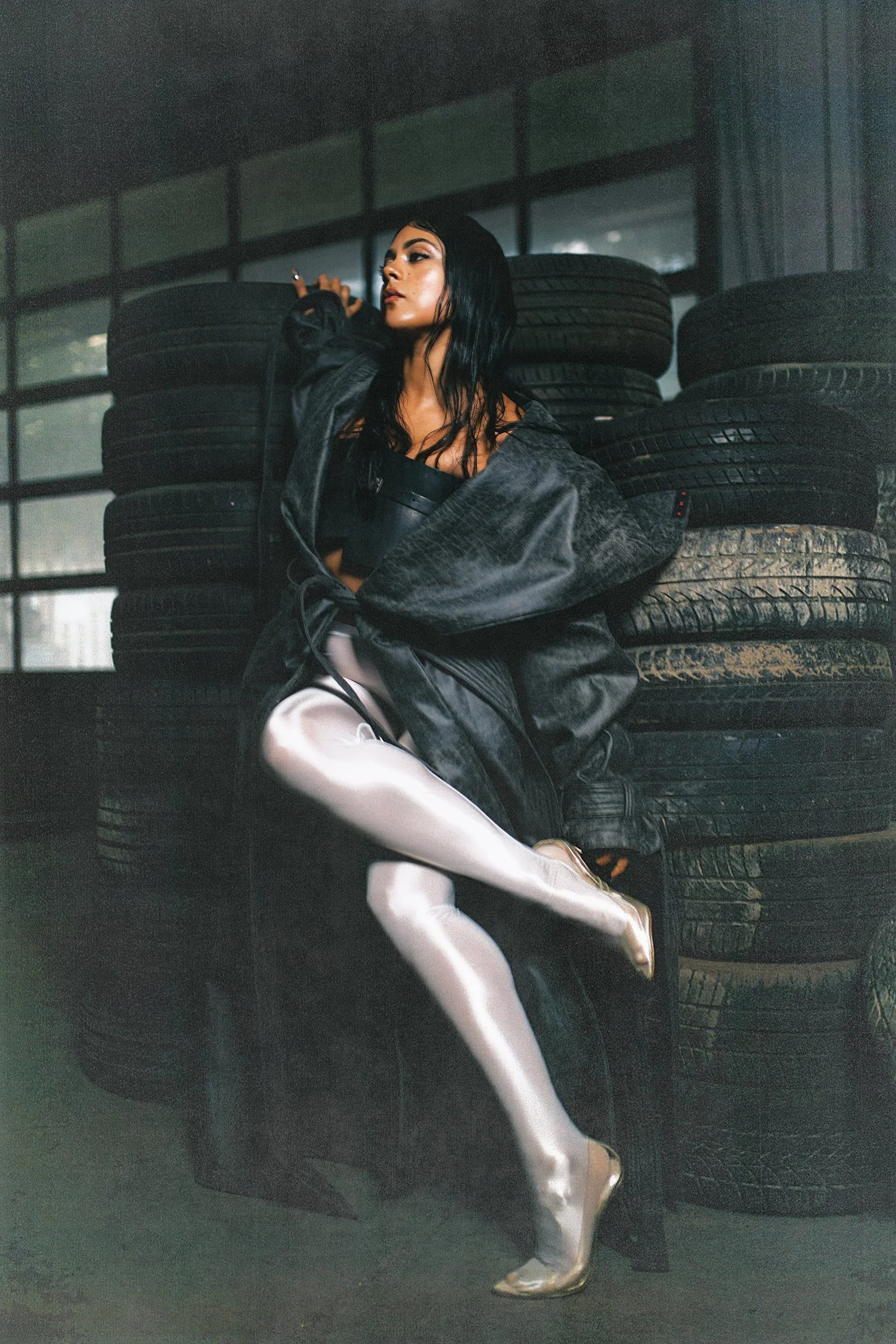 elegance meets abrasion: stiletto boots grounded on oil-stained concrete. The environment amplifies the tension between softness and strength that defines Anna’s artistic identity. The still images are accompanied by a performance that transitions into a video, capturing her movement with precision and intention. Fluid yet controlled, her gestures cut through space and transform the location into a stage.