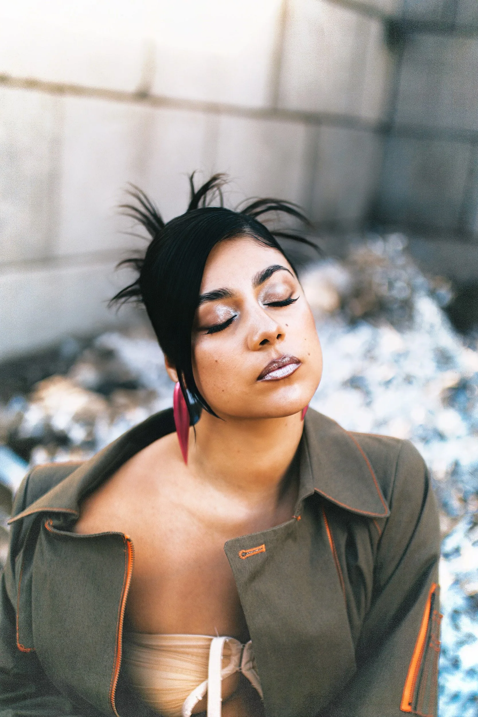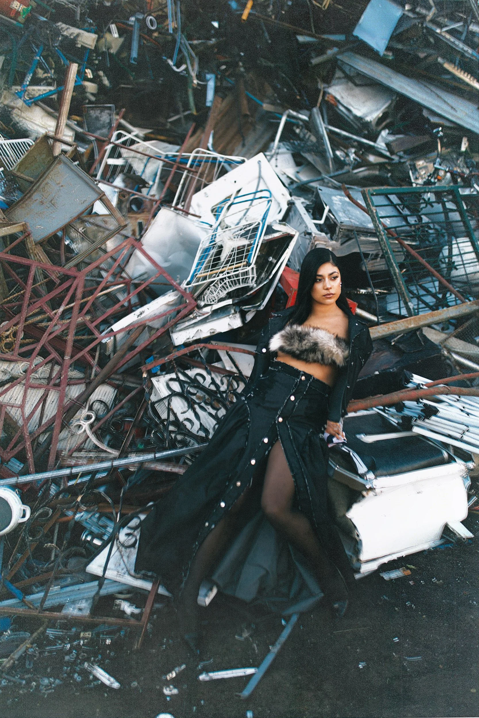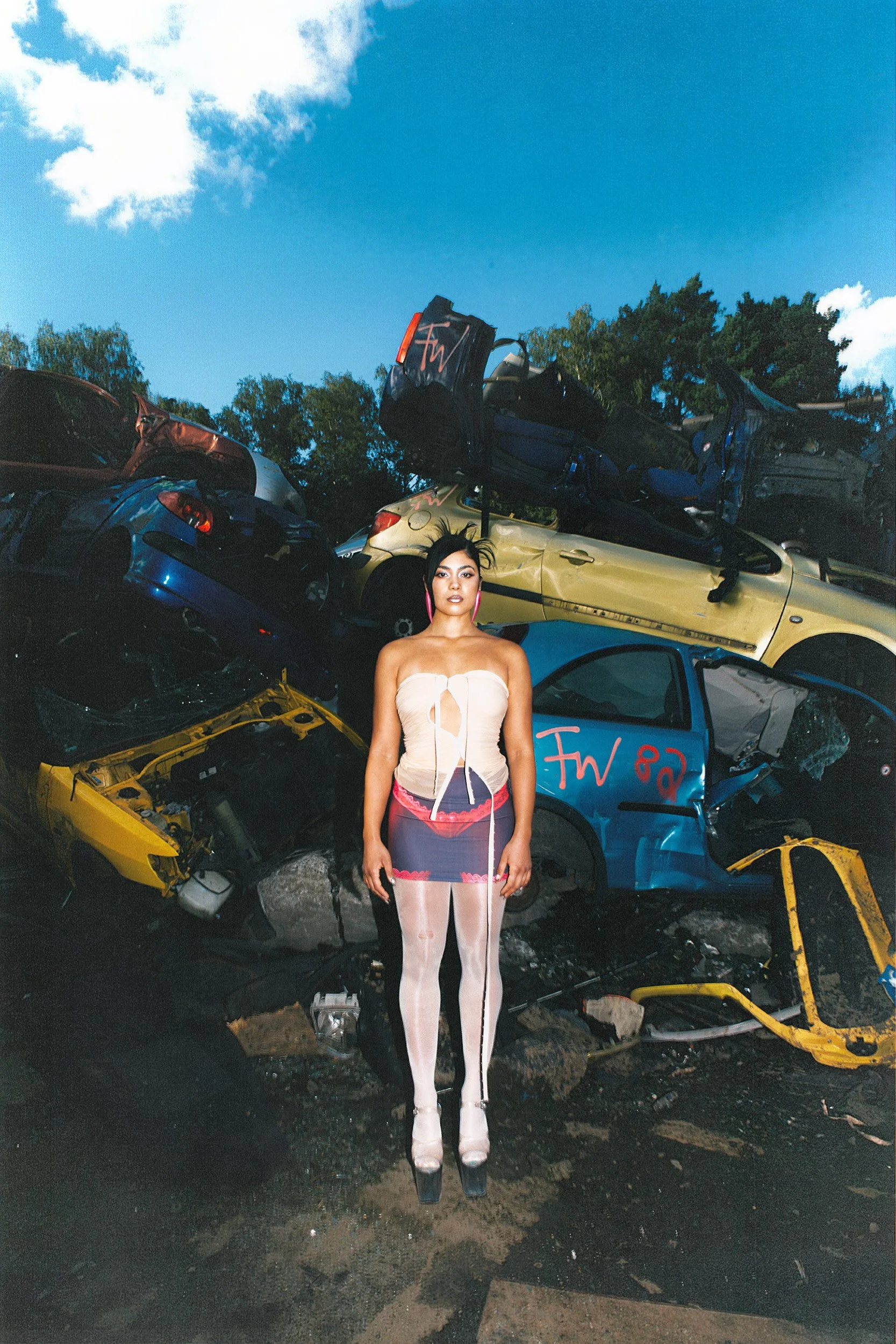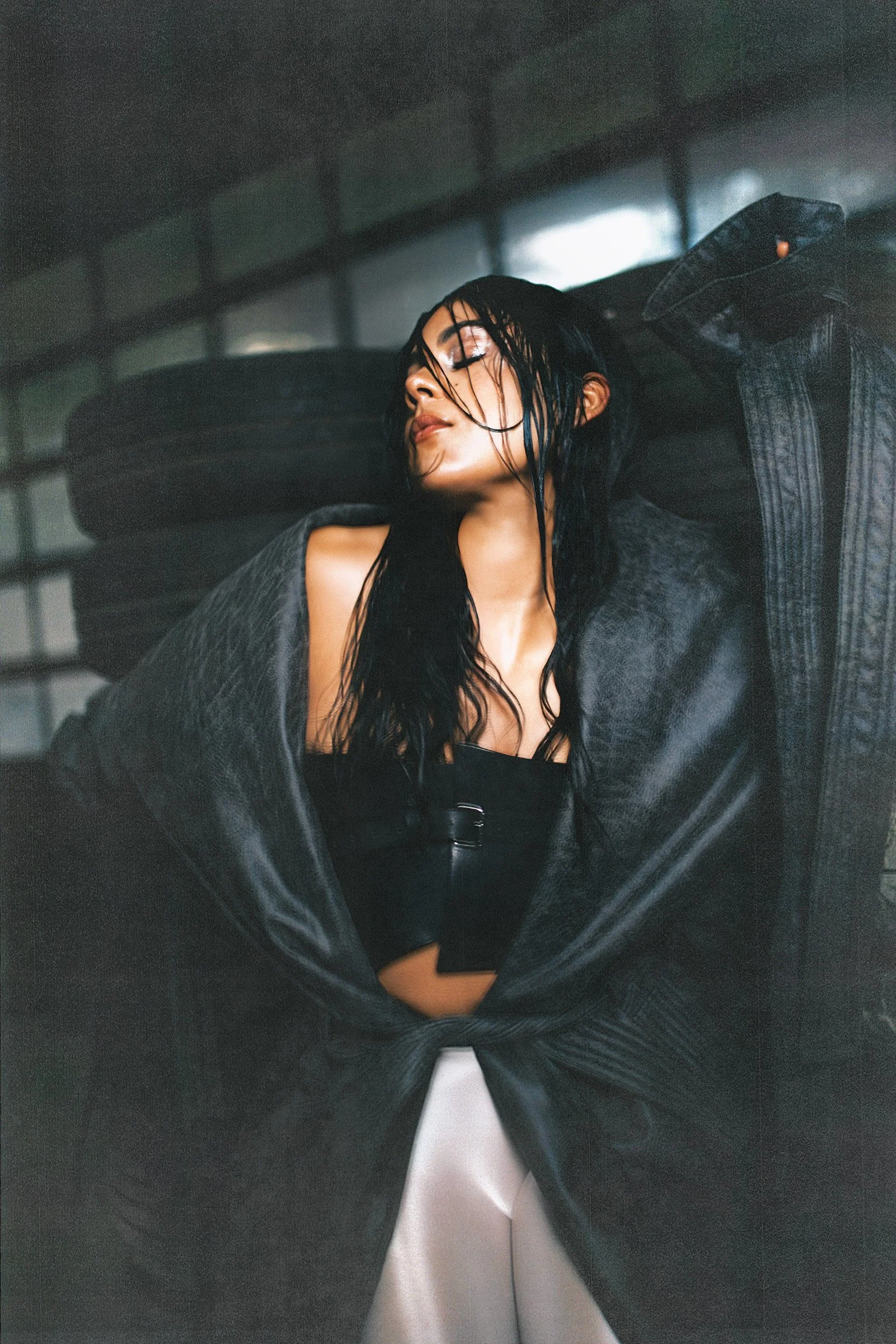 elegance meets abrasion: stiletto boots grounded on oil-stained concrete. The environment amplifies the tension between softness and strength that defines Anna’s artistic identity. The still images are accompanied by a performance that transitions into a video, capturing her movement with precision and intention. Fluid yet controlled, her gestures cut through space and transform the location into a stage.
